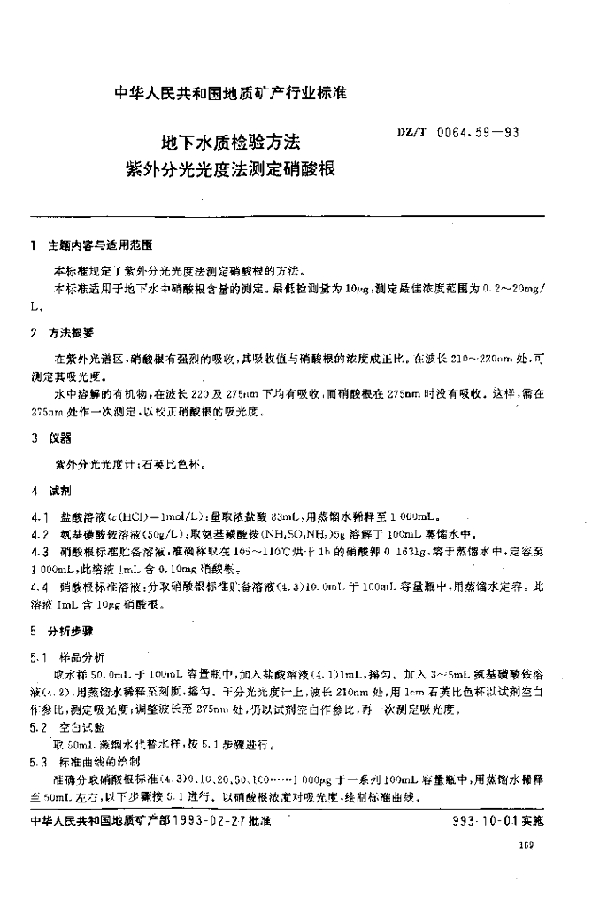 DZ/T 0064.59-1993 地下水质检验方法 紫外分光光度法测定硝酸根