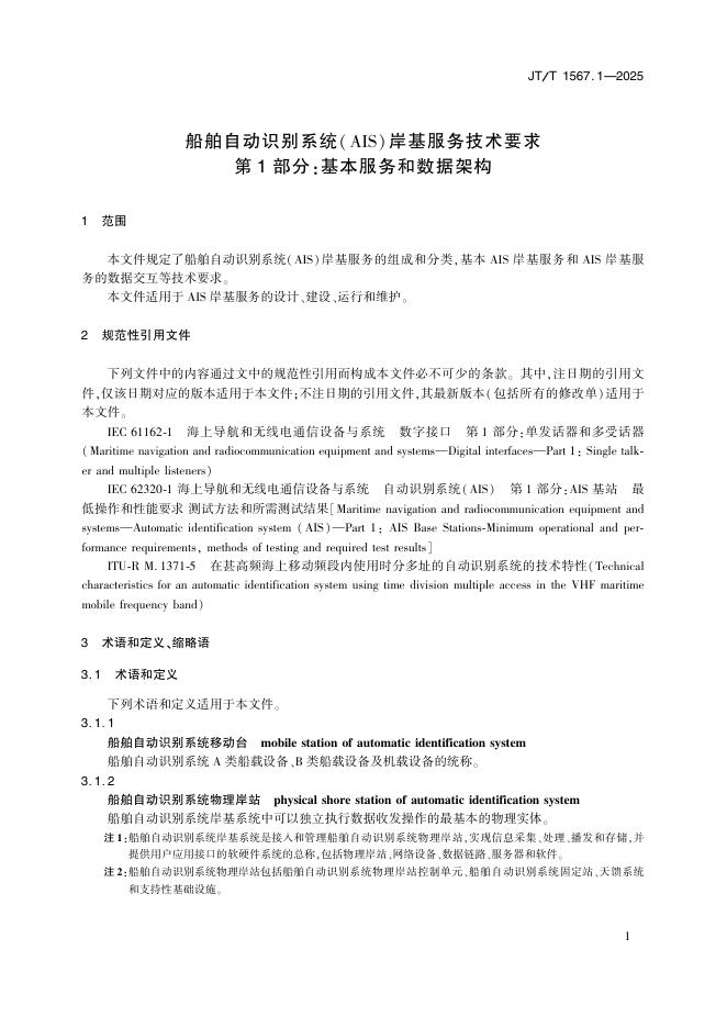 JT/T 1567.1-2025 船舶自动识别系统(AIS)岸基服务技术要求 第1部分:基本服务和数据架构