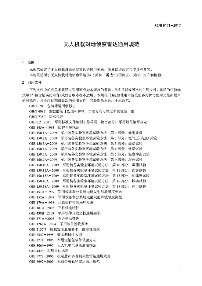 GJB 9171-2017 无人机载对地侦查雷达通用规范