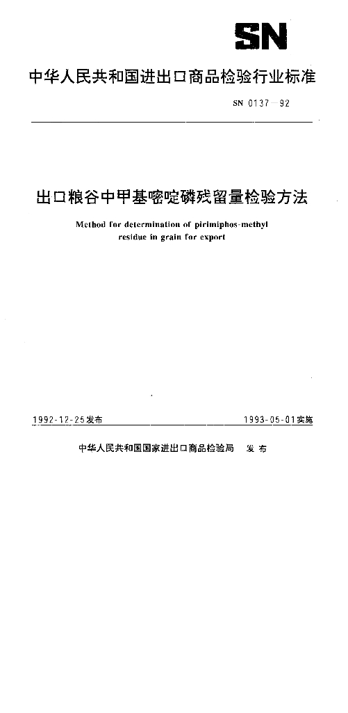 SN 0137-1992 出口粮谷中甲基嘧啶磷残留量检验方法