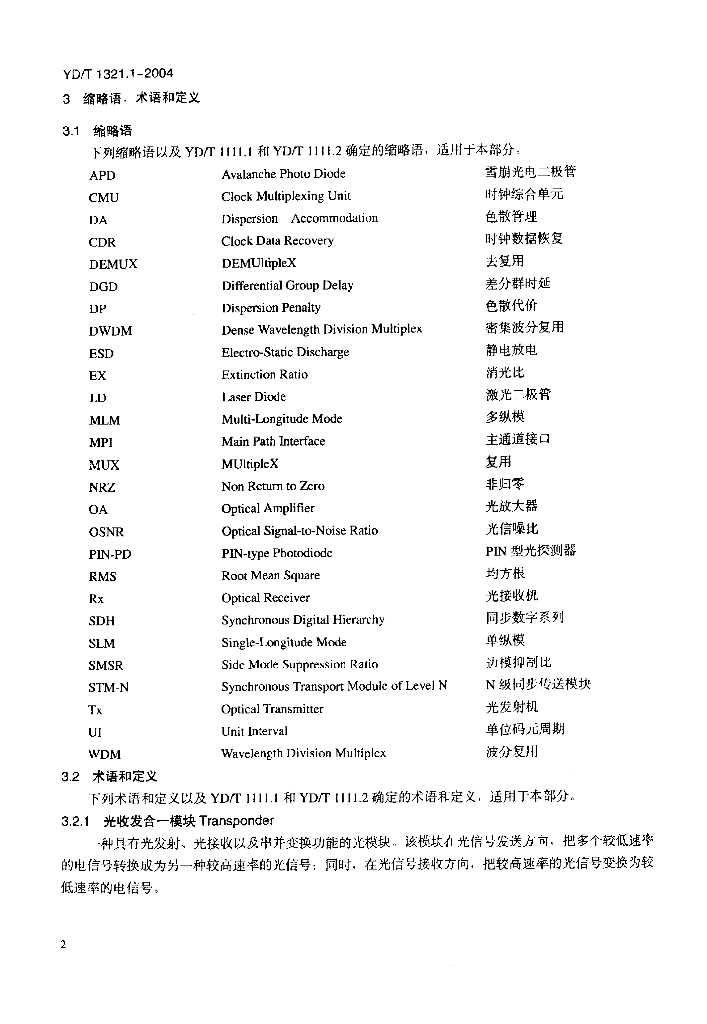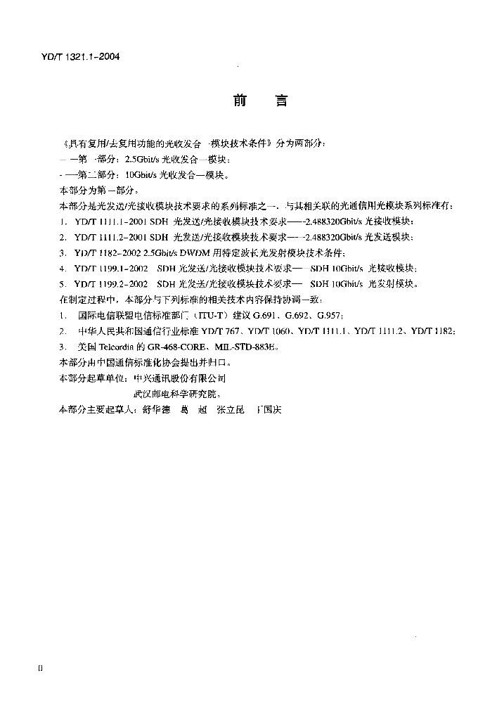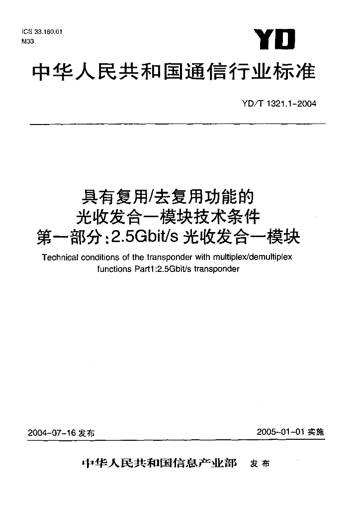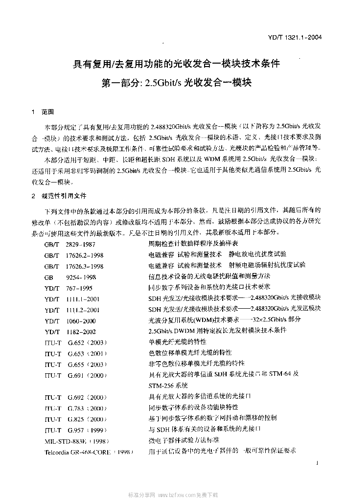 YD/T 1321.1-2004 具有复用/去复用功能的光收发合一模块技术条件 第一部分:2.5Gbit/s 光收发合一模块