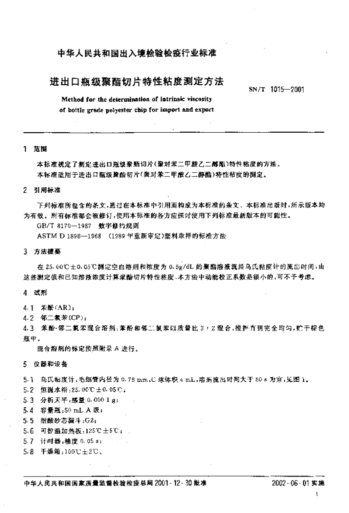 SN/T 1015-2001 进出口瓶级聚酯切片特性粘度测定方法