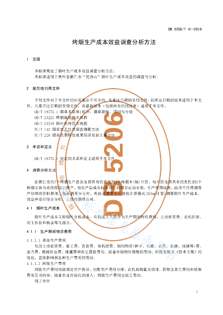 DB5206/T 41-2018 烤烟生产成本效益调查分析方法