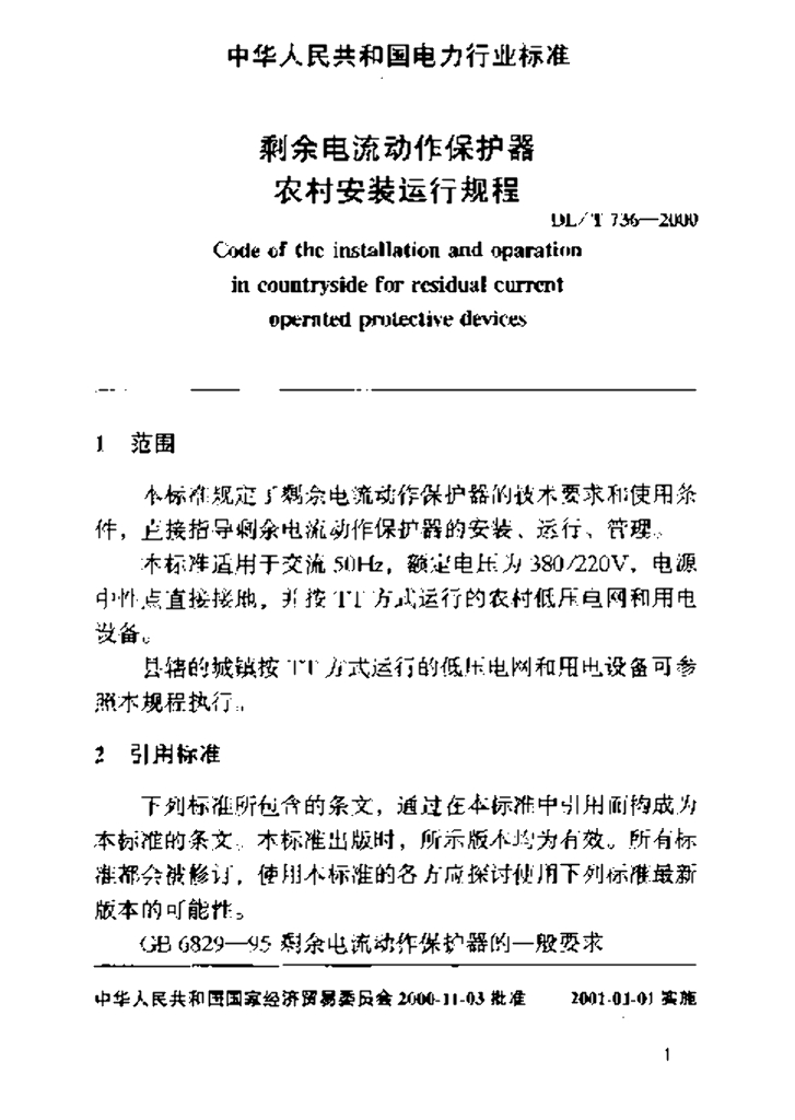 DL/T 736-2000 剩余电流动作保护器农村安装运行规程