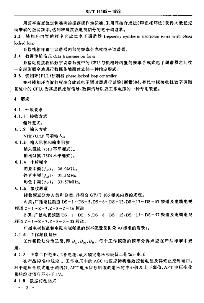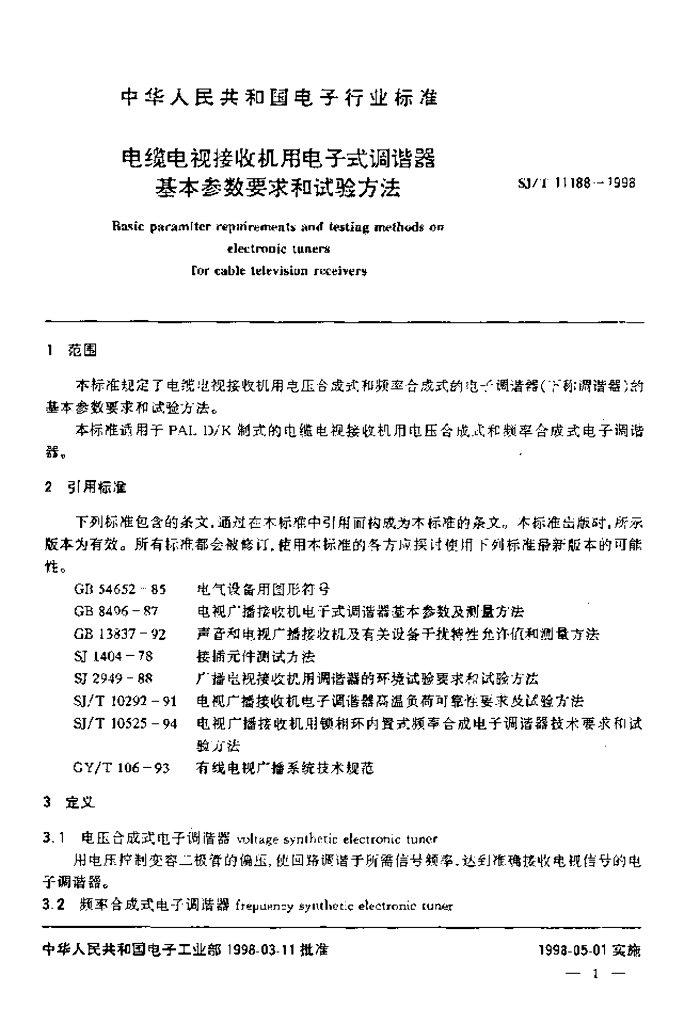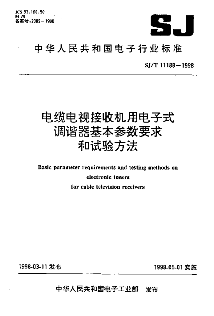 SJ/T 11188-1998 电缆电视接收机用电子式调谐器基本参数要求和试验方法