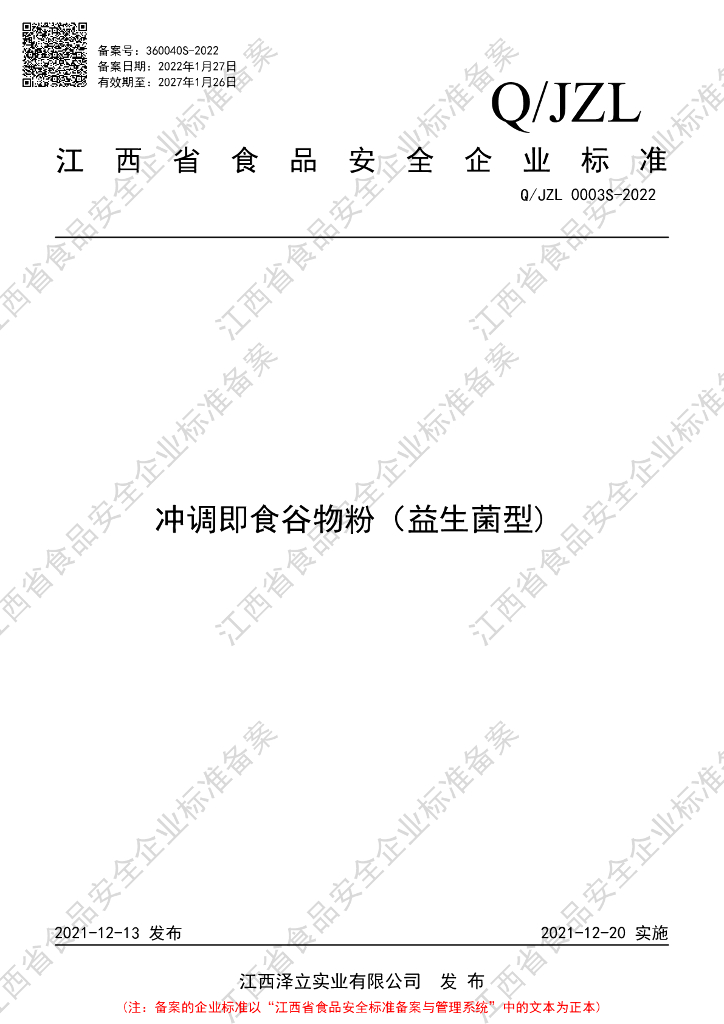 Q/JZL 0003S-2022 冲调即食谷物粉(益生菌型)