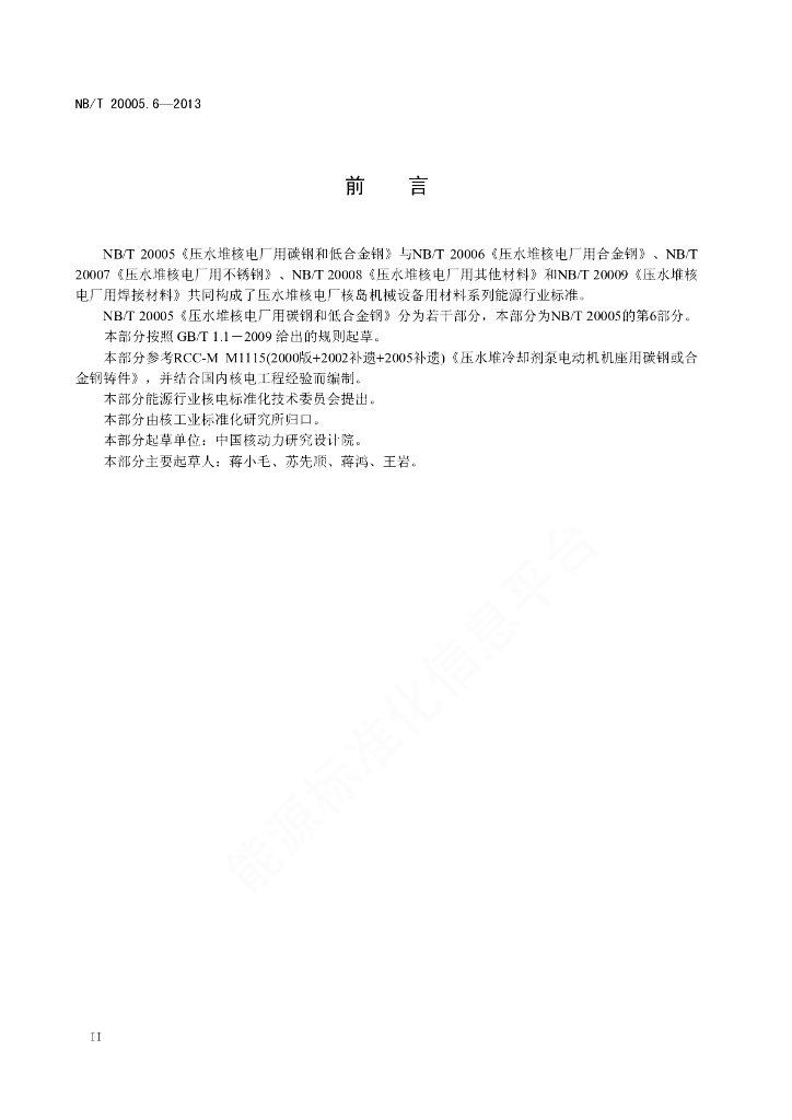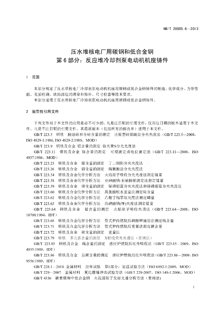 NB/T 20005.6-2013 压水堆核电厂用碳钢和低合金钢 第6部分:反应堆冷却剂泵电动机机座铸件