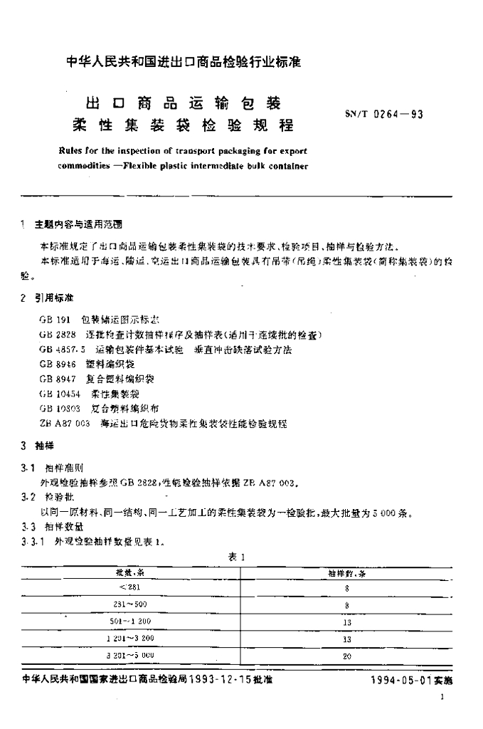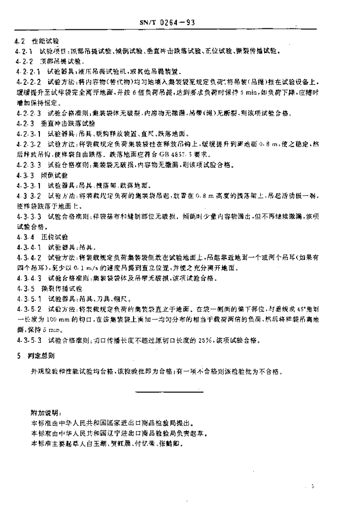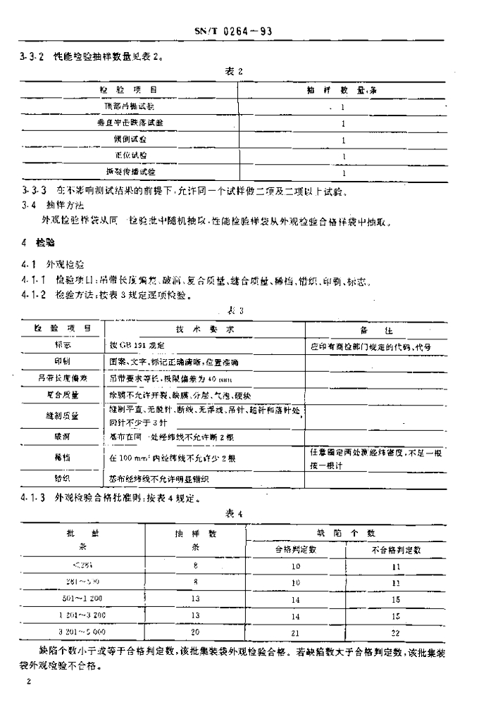 SN/T 0264-1993 出口商品运输包装 柔性集装袋检验规程