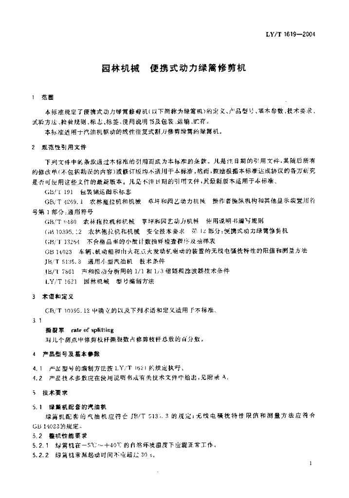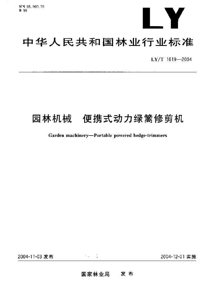 LY/T 1619-2004 园林机械 便携式动力绿篱修剪机
