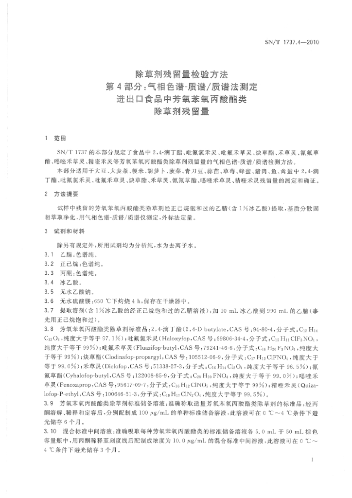 SN/T 1737.4-2010 除草剂残留量检验方法 第4部分:气相色谱-质谱/质谱法测定进出口食品中芳氧苯氧丙酸酯类除草剂残留量