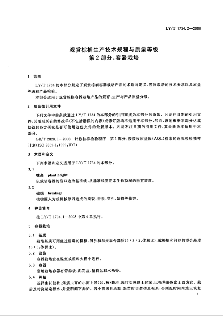 LY/T 1734.2-2008 观赏棕榈生产技术规程与质量等级 第2部分:容器栽培