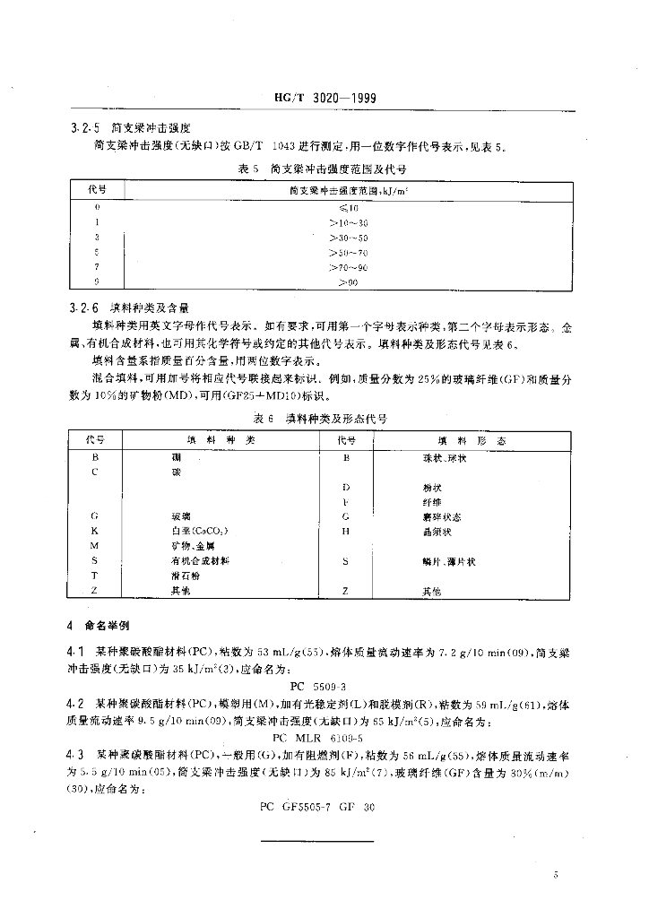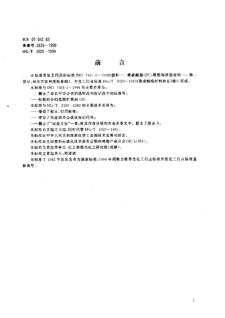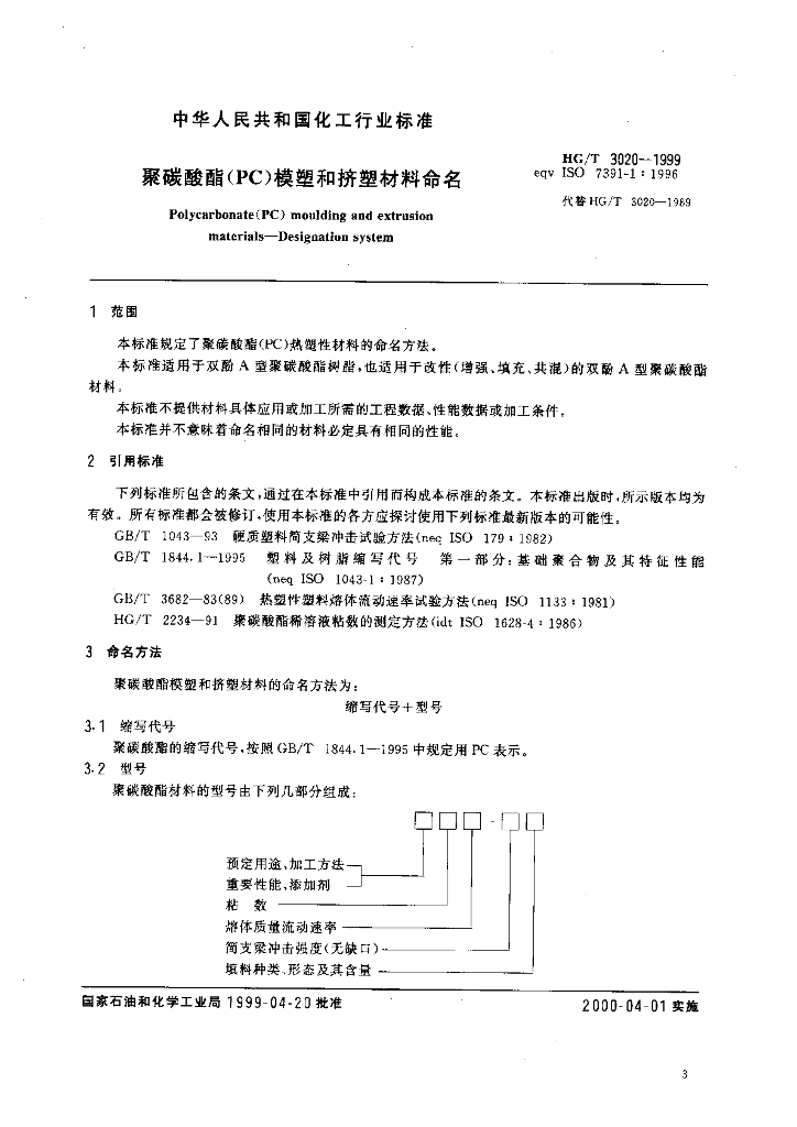 HG/T 3020-1999 聚碳酸酯(PC)模塑和挤塑材料命名