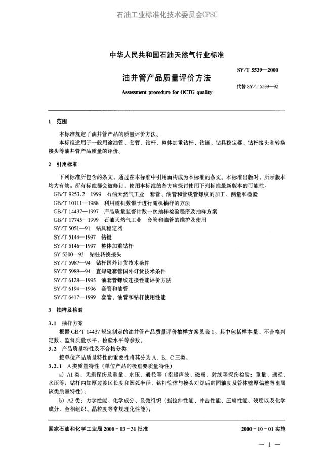 SY/T 5539-1992 石油专用管产品质量评价方法