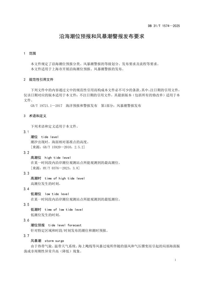 DB31/T 1574-2025 沿海潮位预报和风暴潮警报发布要求