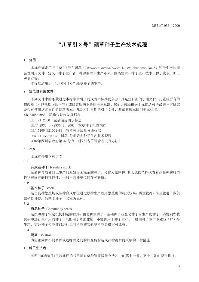 DB51/T 958-2009 川草引3号虉草种子生产技术规程