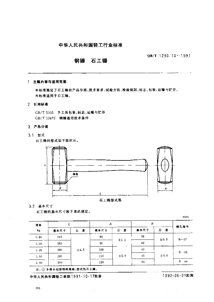 QB/T 1290.10-1991 钢锤石工锤