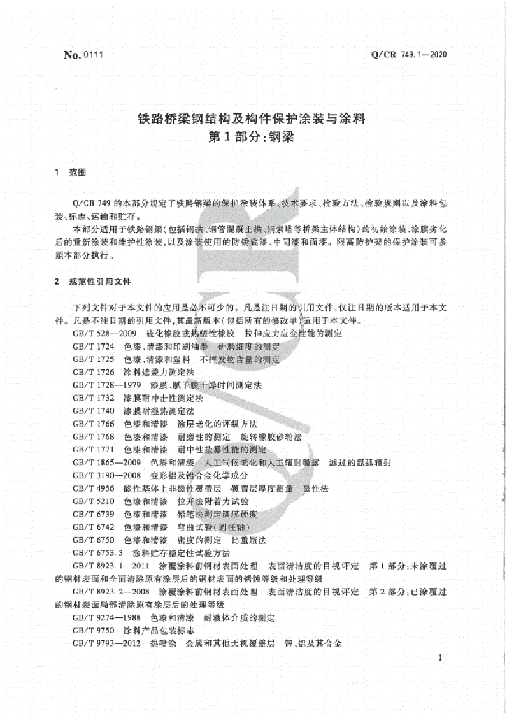 Q/CR 749.1-2020 铁路桥梁钢结构及构件保护涂装与涂料 第1部分 钢梁