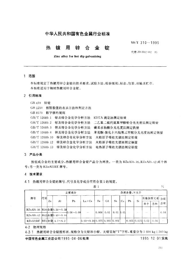 SY/T 310-1995 热镀用锌合金锭