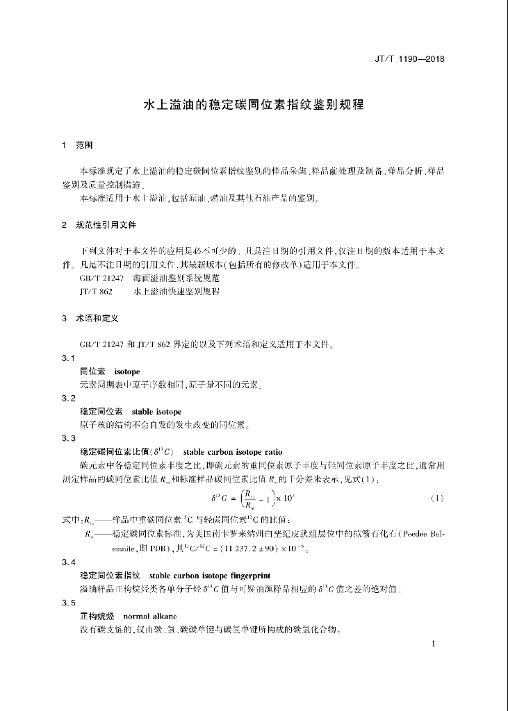 JT/T 1190-2018 水上溢油的稳定碳同位素指纹鉴别规程