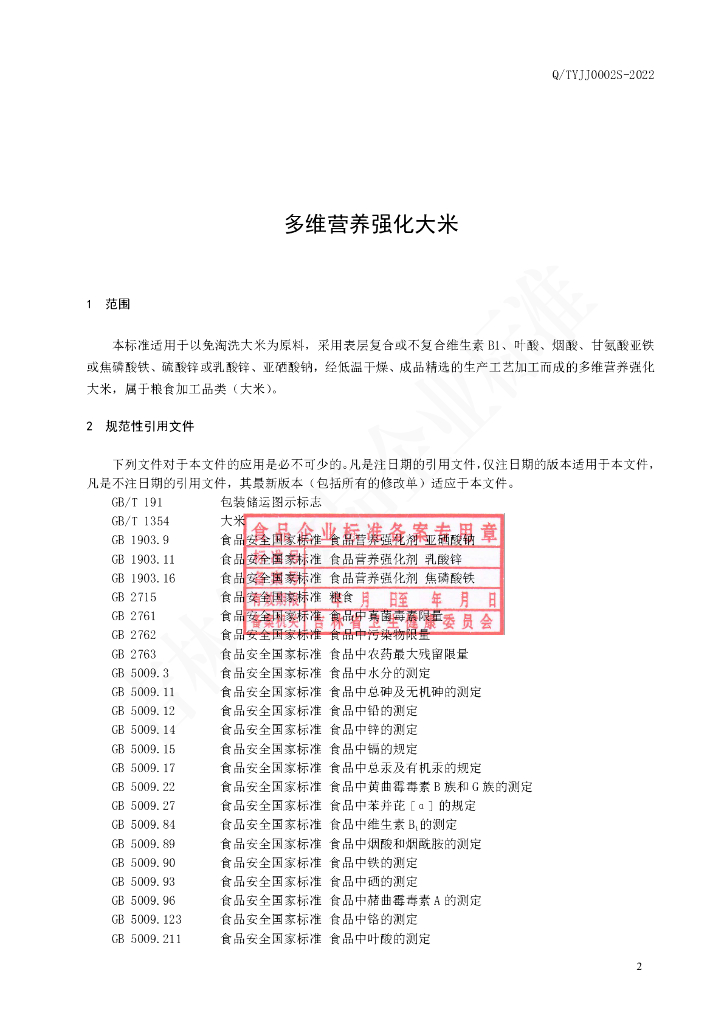 Q/TYJJ 0002S-2022 多维营养强化大米
