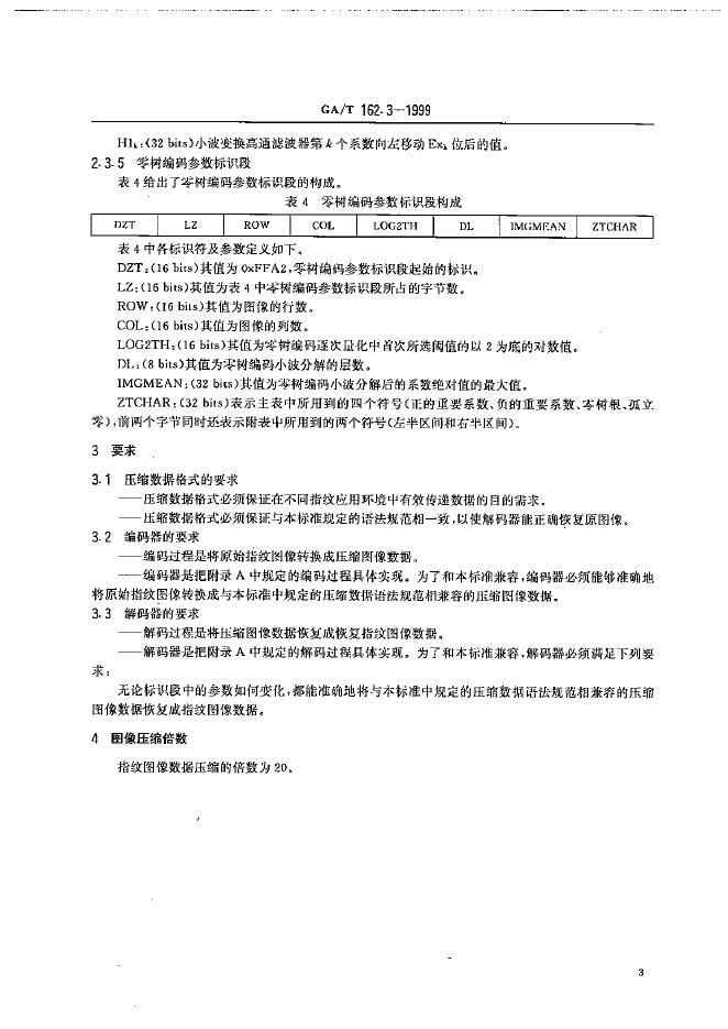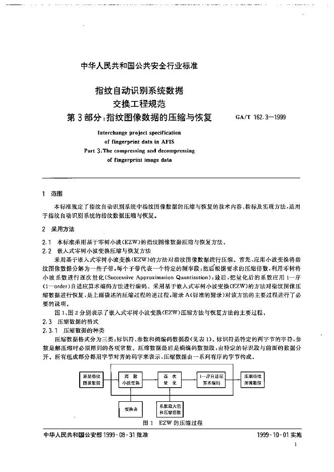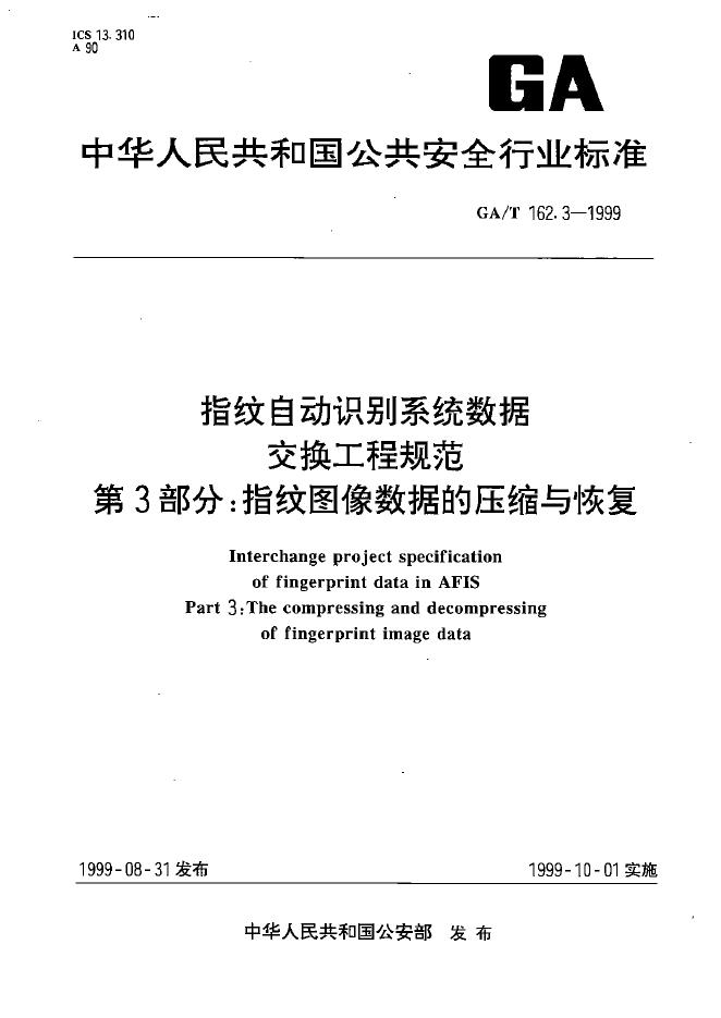 GA/T 162.3-1999 指纹自动识别系统数据交换工程规范 指纹图象数据的压缩与恢复