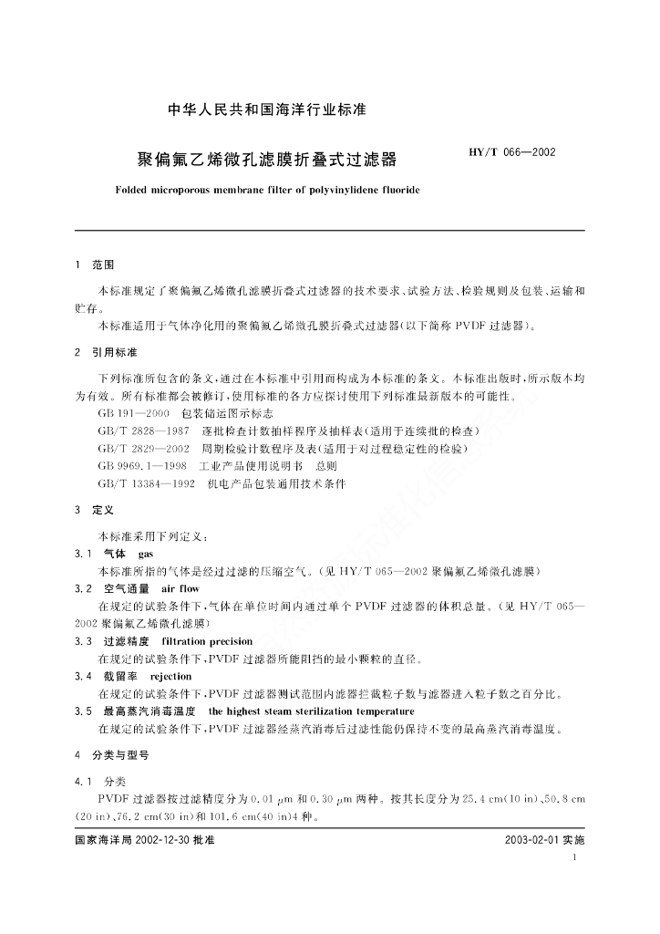 HY/T 066-2002 聚偏氟乙烯微孔滤膜折叠式过滤器