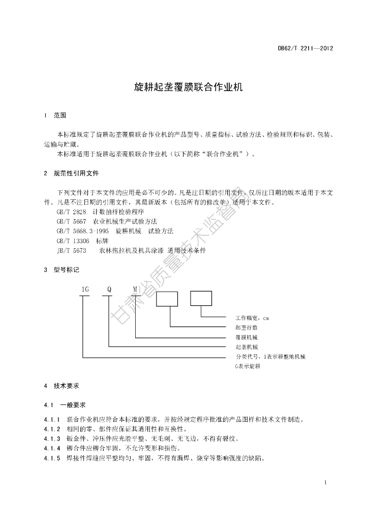 DB62/T 2211-2012 旋耕起垄覆膜联合作业机