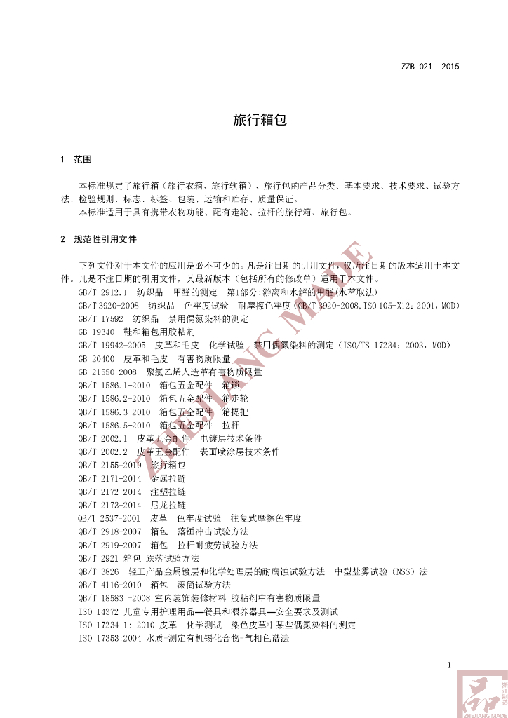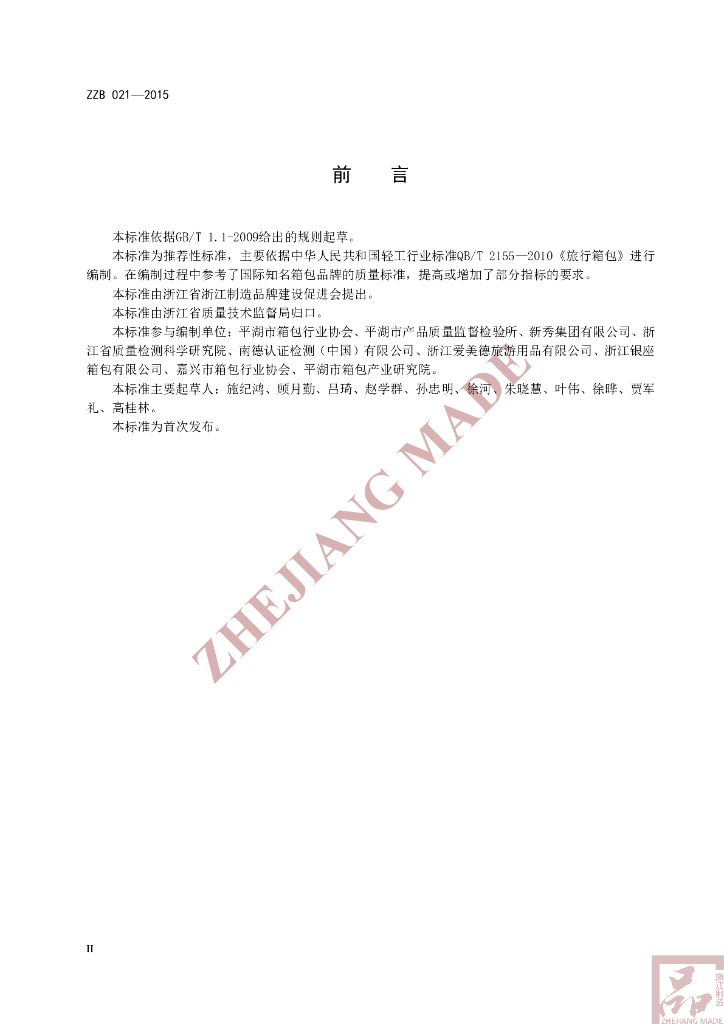 本标准参与编制单位:平湖市箱包行业协会、平湖市产品质量监督检验所、新秀集团有限公司、浙江省质量检测科学研究院、南德认证检测(中国)有限公司、浙江爱美德旅游用品有限公司、浙江银座箱包有限公司、嘉兴市箱包行业协会、平湖市箱包产业研究院。