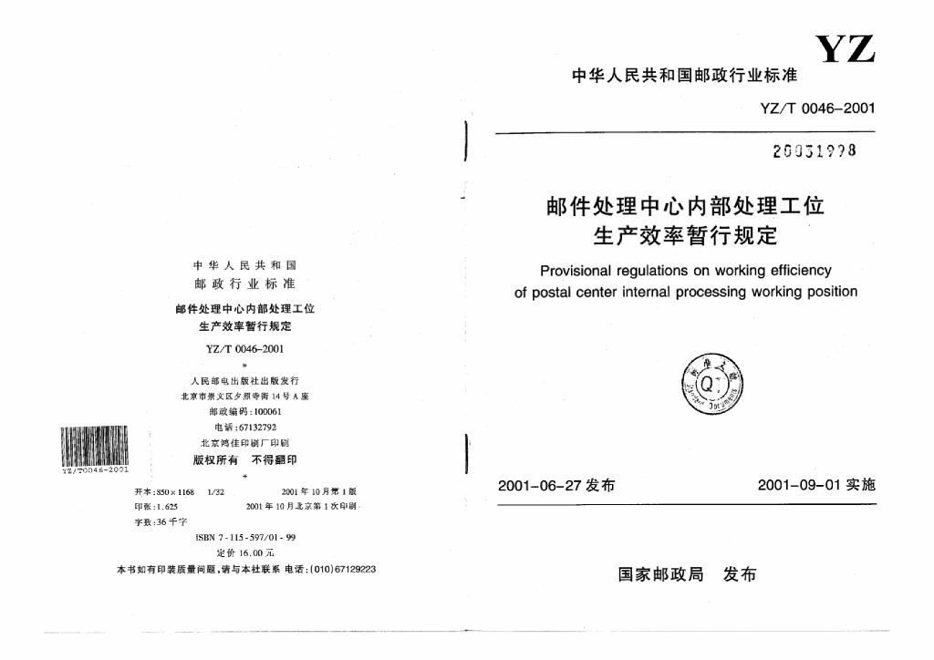 YZ/T 0046-2001 邮件处理中心内部处理工位生产效率暂行规定