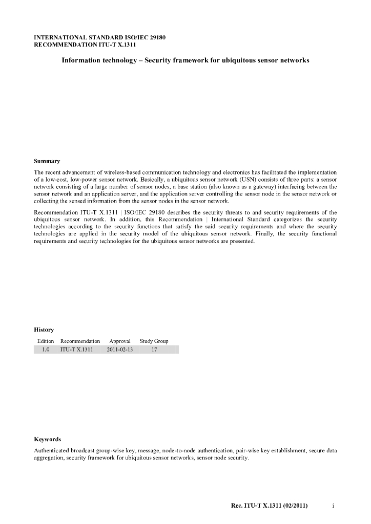 ITU-T X.1311-2011 信息技术 泛在传感网络的安全框架