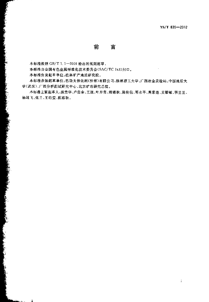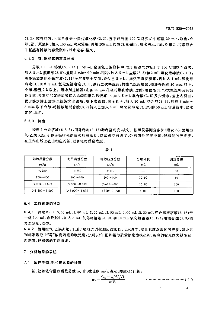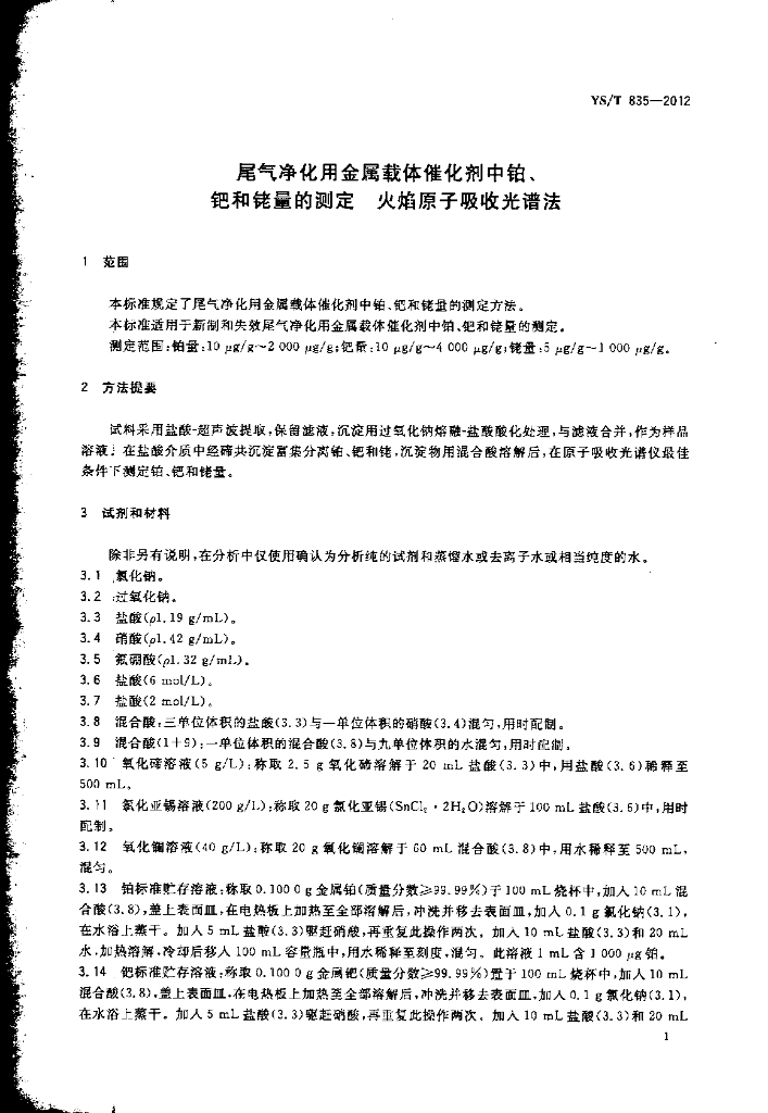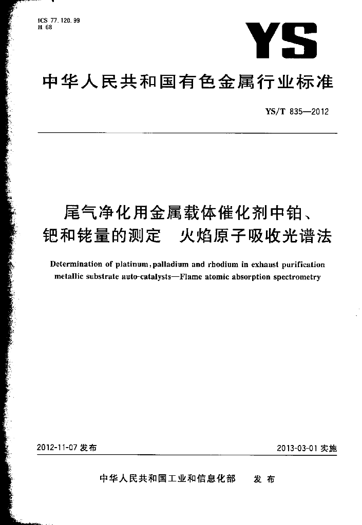 YS/T 835-2012 尾气净化用金属载体催化剂中铂、钯和铑量的测定 火焰原子吸收光谱法