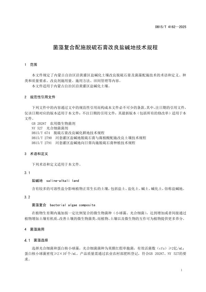 DB15/T 4162-2025 菌藻复合配施脱硫石膏改良盐碱地技术规程