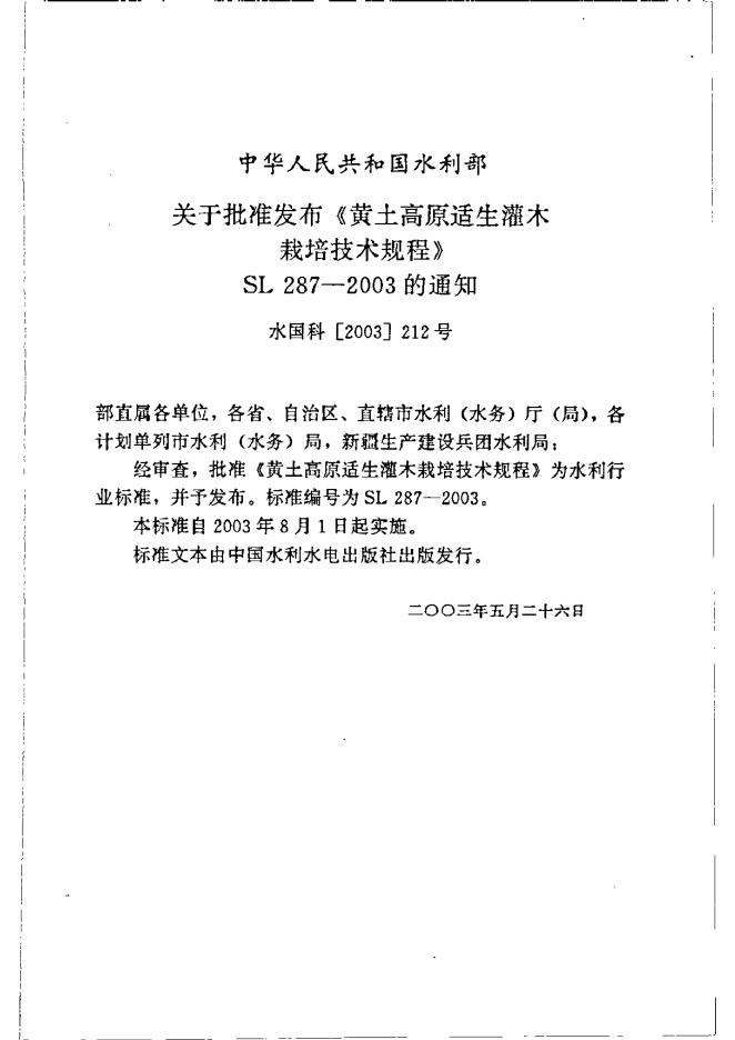 SL 287-2003 黄土高原适生灌木栽培技术规程
