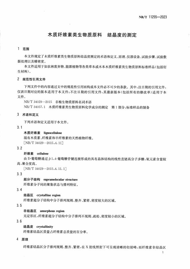 NB/T 11255-2023 木质纤维素类生物质原料 结晶度的测定