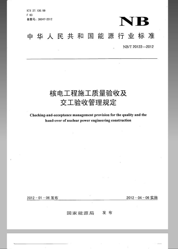 NB/T 20122-2012 核电工程施工质量评定及交工验收管理规定