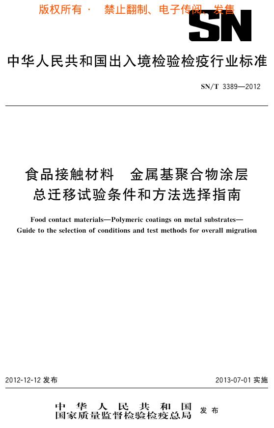 SN/T 3389-2012 食品接触材料 金属基聚合物涂层 总迁移试验条件和方法选择指南