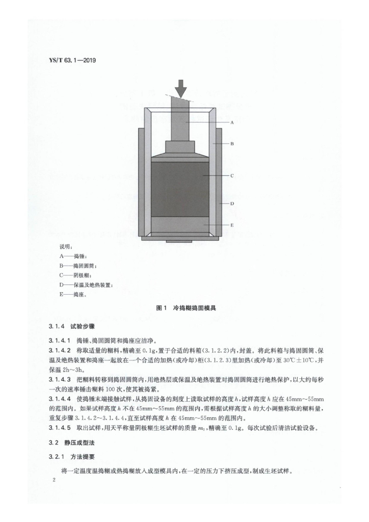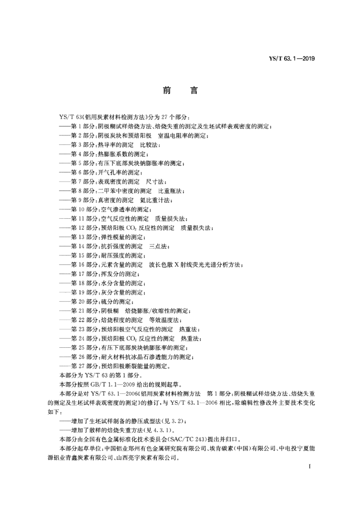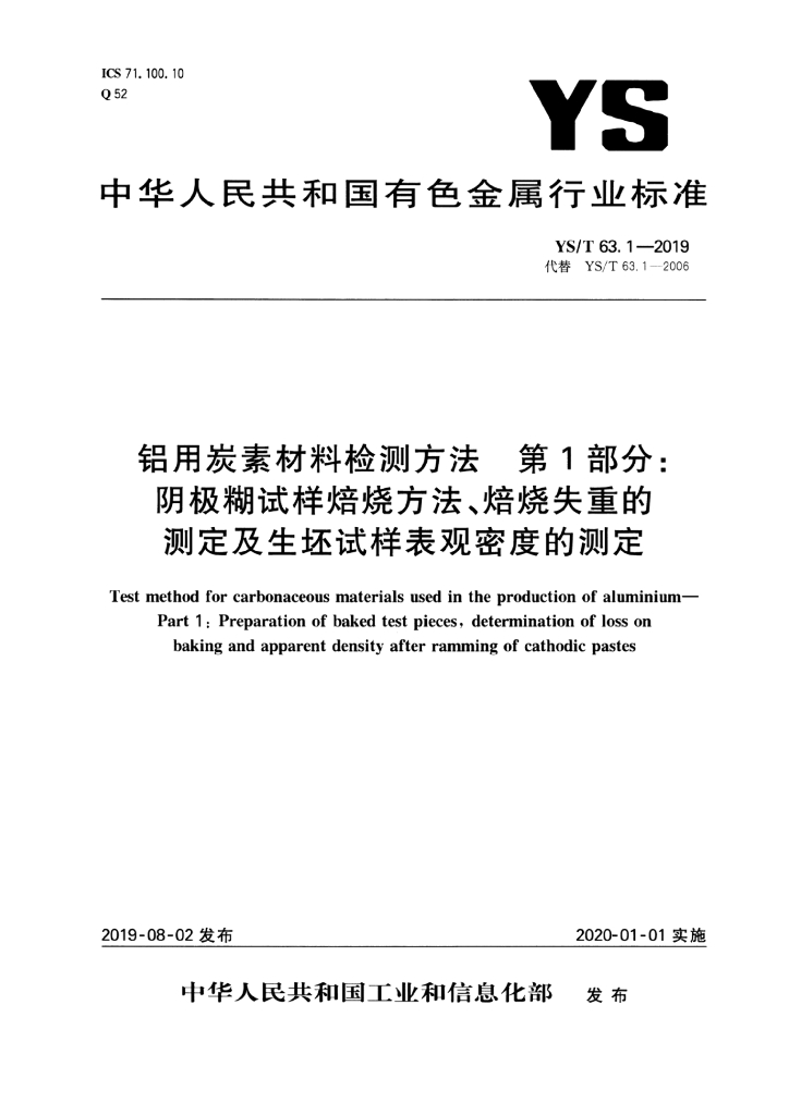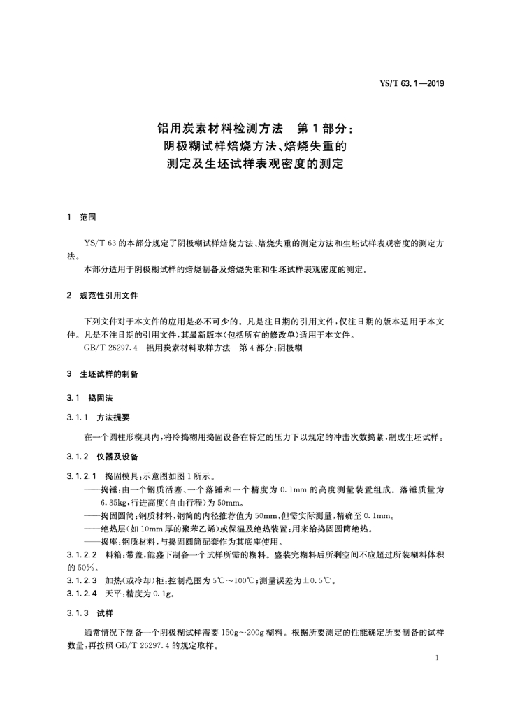 YS/T 63.1-2019 铝用炭素材料检测方法 第1部分:阴极糊试样焙烧方法、焙烧失重的测定及生坯试样表观密度的测定