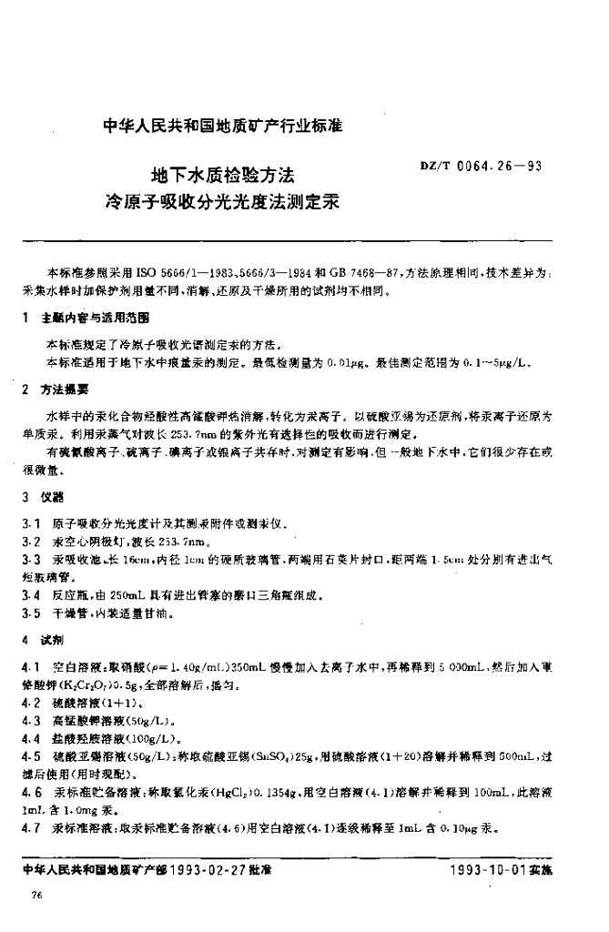 DZ/T 0064.26-1993 地下水质检验方法冷原子吸收分光光度法测定汞