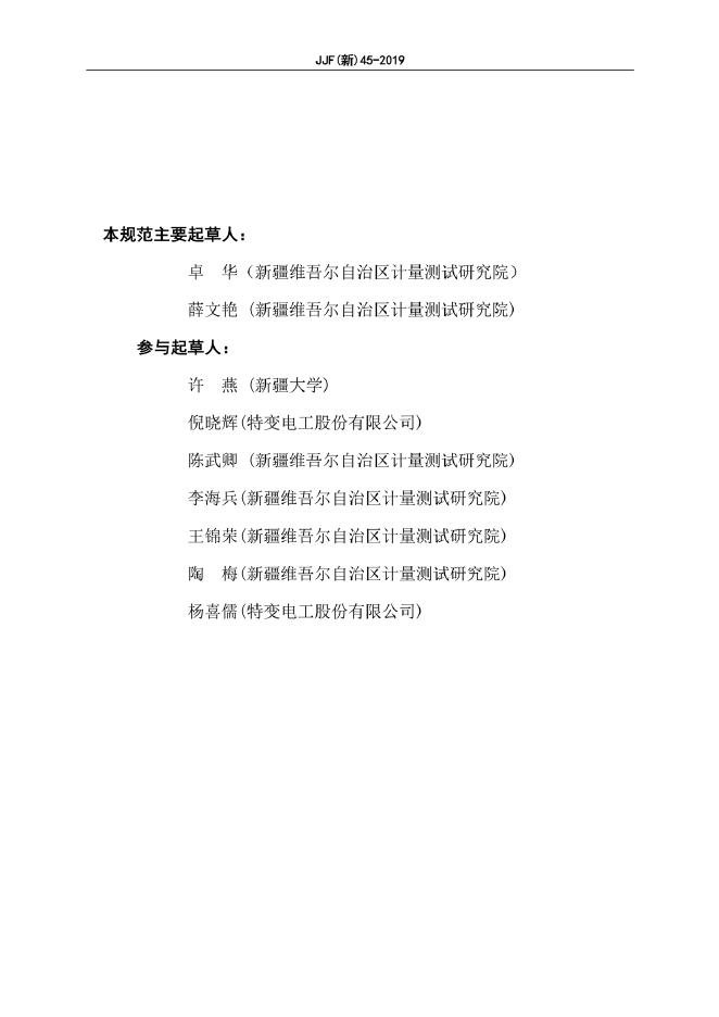 卓华(新疆维吾尔自治区计量测试研究院)、薛文艳(新疆维吾尔自治区计量测试研究院)、许燕(新疆大学)、倪晓辉(特变电工股份有限公司)、陈武卿(新疆维吾尔自治区计量测试研究院)、李海兵(新疆维吾尔自治区计量测试研究院)、王锦荣(新疆维吾尔自治区计量测试研究院)、陶梅(新疆维吾尔自治区计量测试研究院)、杨喜儒(特变电工股份有限公司)
