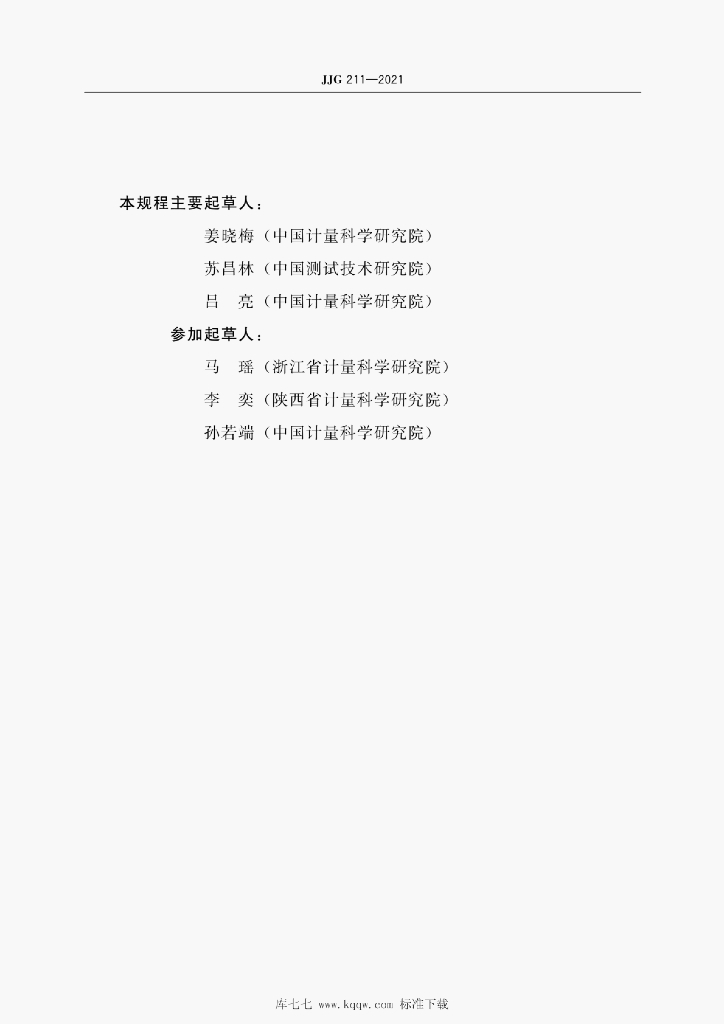 姜晓梅(中国计量科学研究院)、苏昌林(中国测试技术研究院)、吕亮(中国计量科学研究院)、马瑶(浙江省计量科学研究院)、李奕(陕西省计量科学研究院)、孙若端(中国计量科学研究院)
