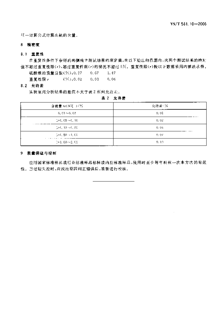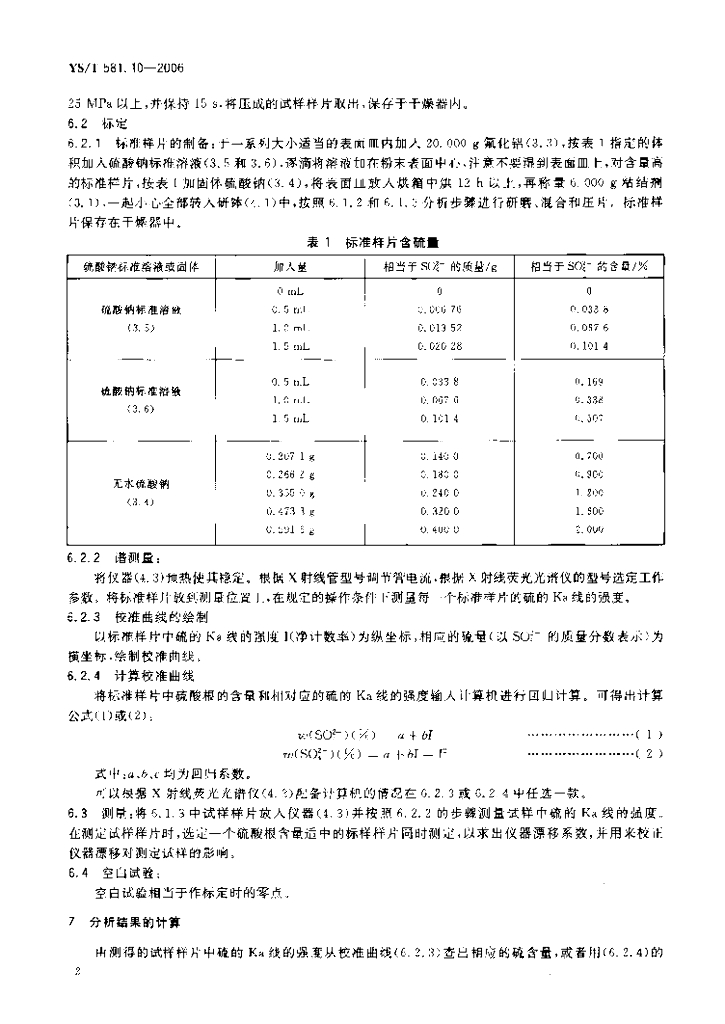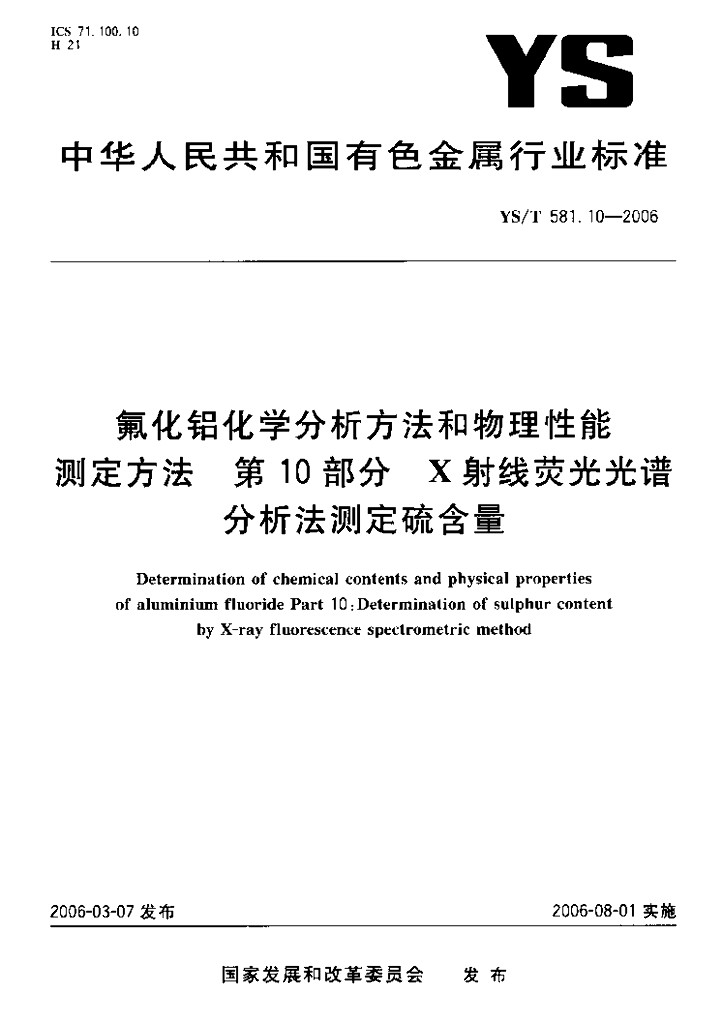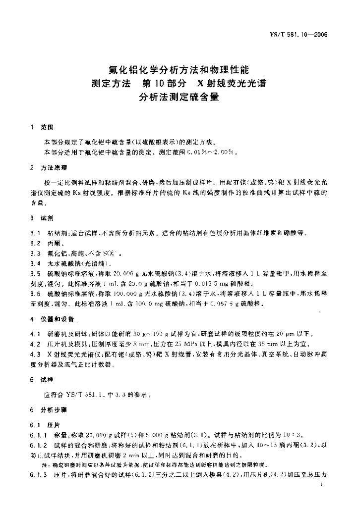 YS/T 581.10-2006 氟化铝化学分析方法和物理性能测定方法 第10部分:X射线荧光光谱分析法测定硫含量