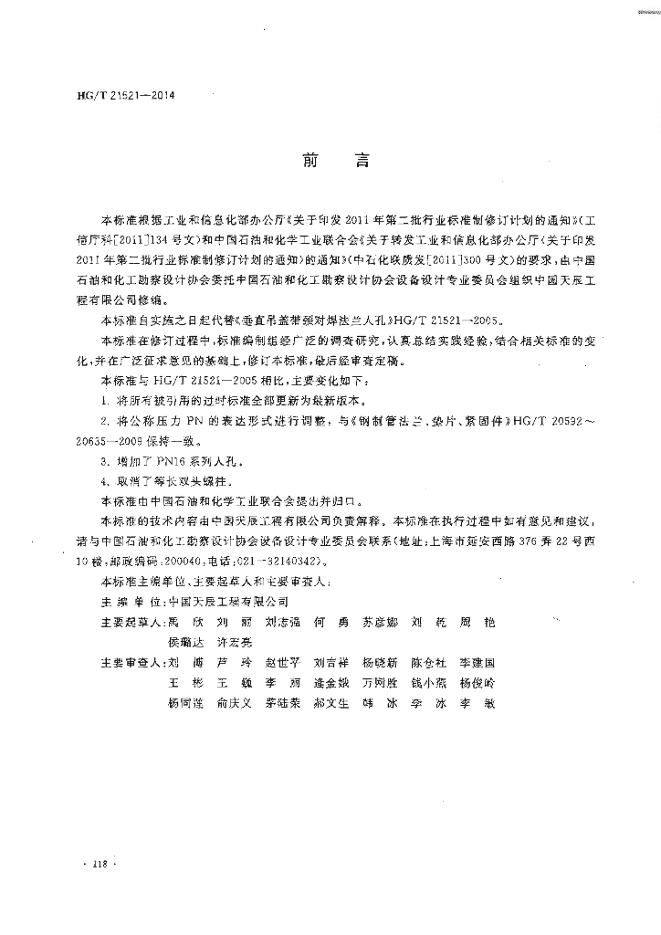 HG/T 21521-2014 代替 HG/T 21521-2005 垂直吊盖带颈对焊法兰人孔