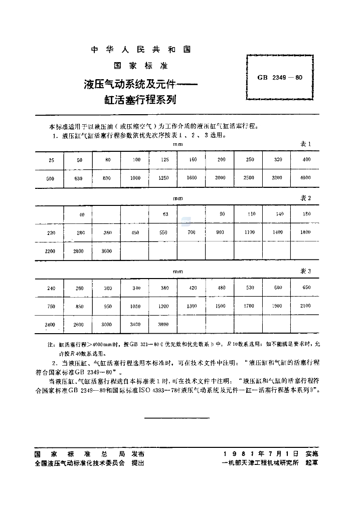 GB/T 2349-1980 液压气动系统及元件 缸活塞行程系列