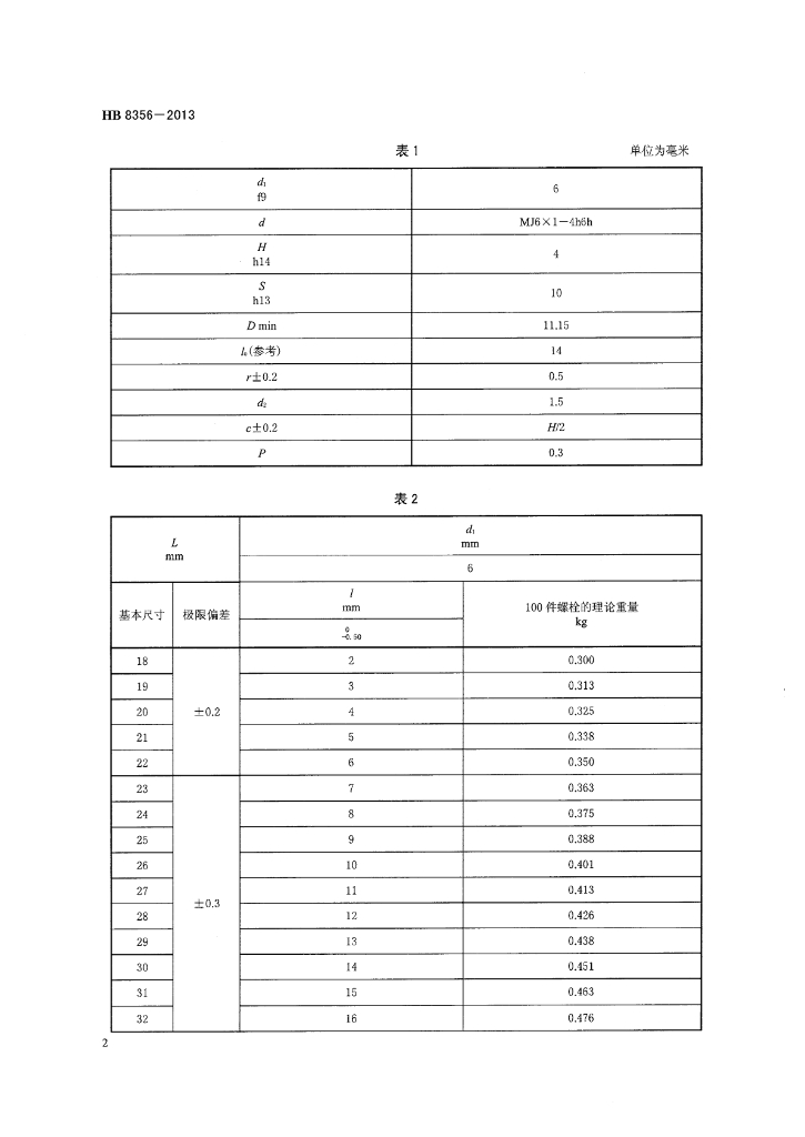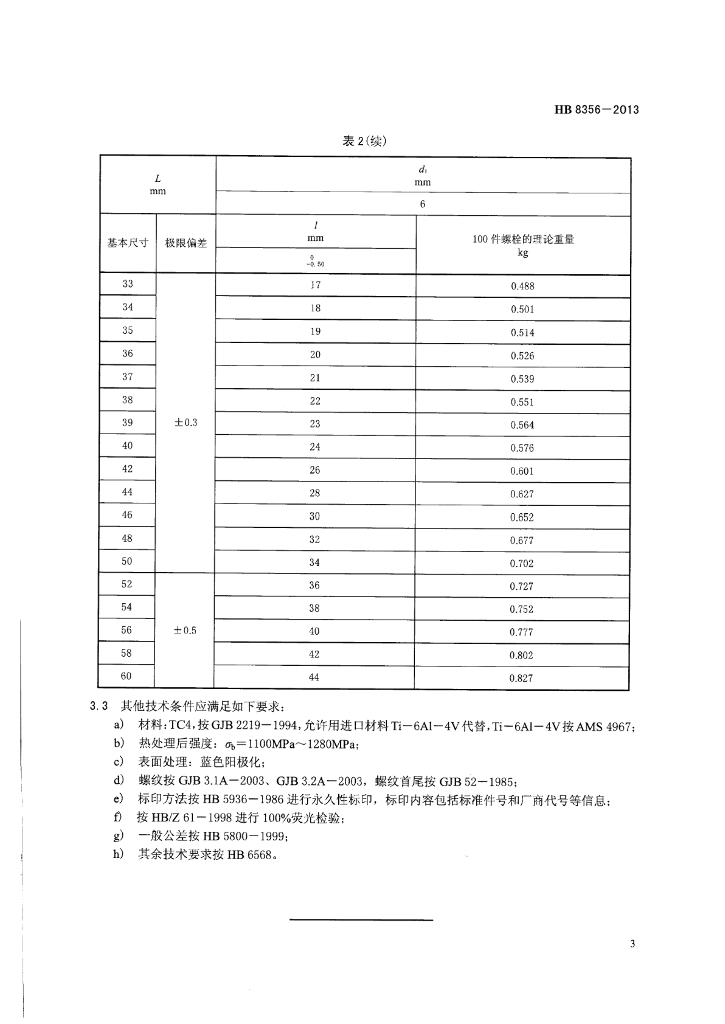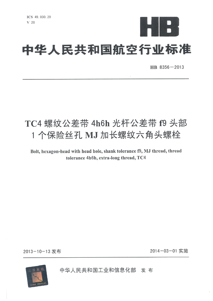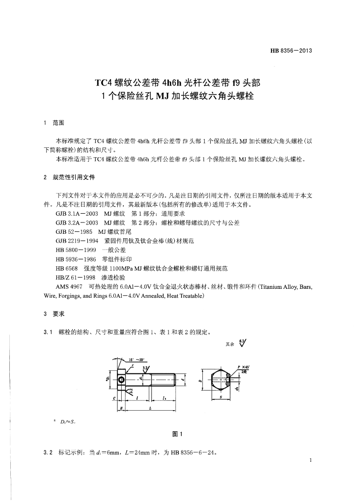 HB 8356-2013 TC4螺纹公差带4h6h光杆公差带f9头部1个保险丝孔MJ加长螺纹六角头螺栓