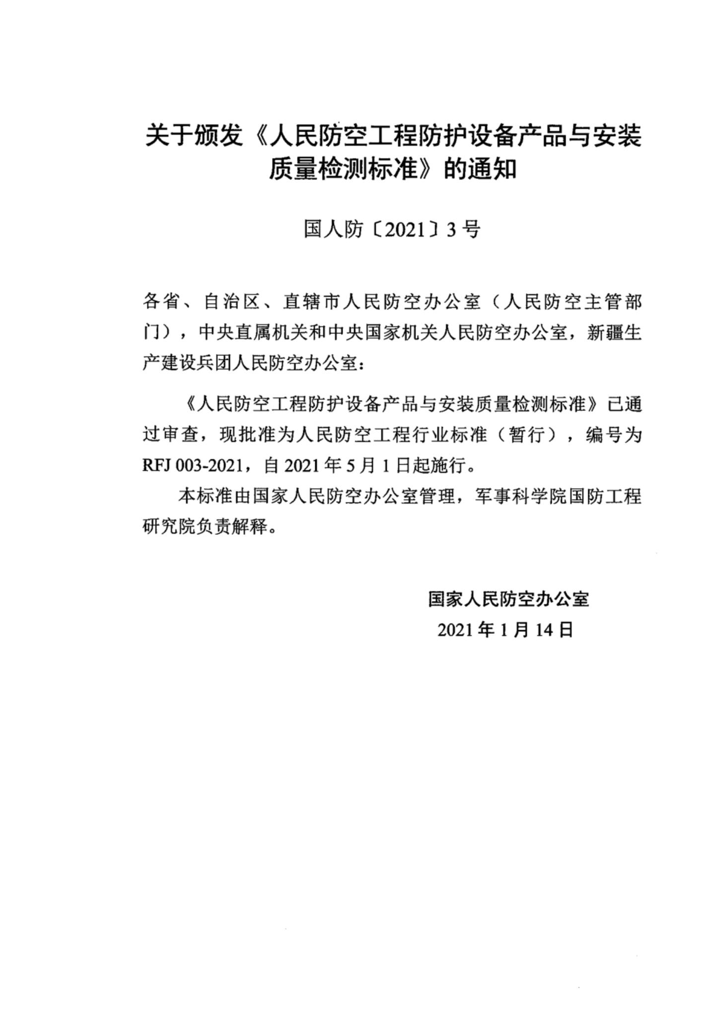 RFJ 003-2021 人民防空工程防护设备产品与安装质量检测标准(暂行)