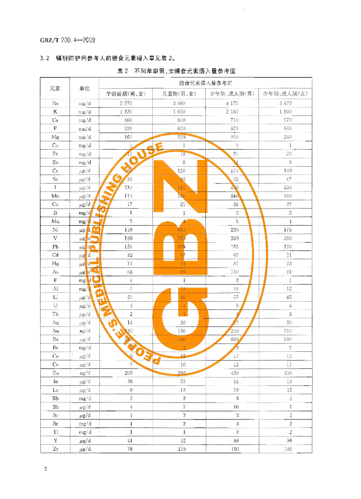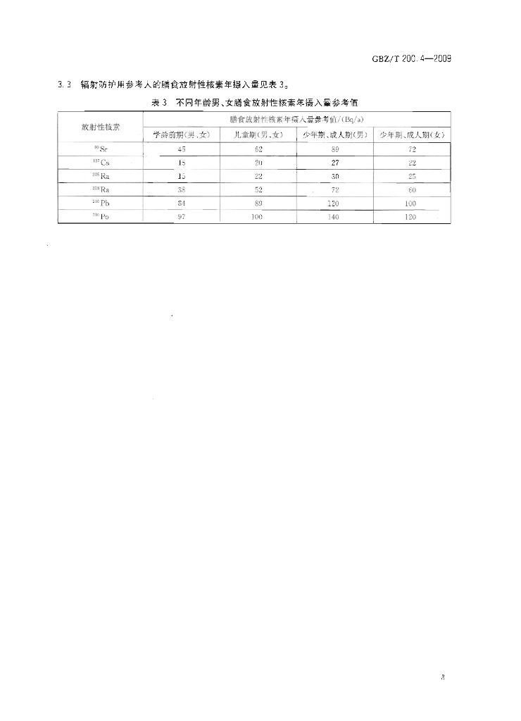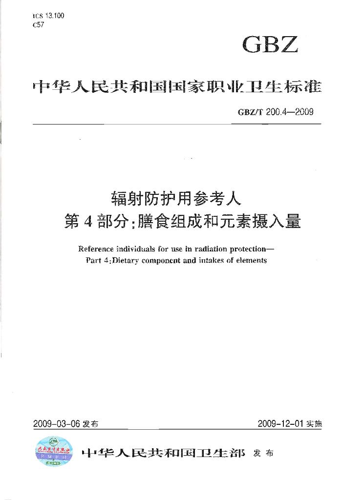 GBZ/T 200.4-2009 辐射防护用参考人 第4部分:膳食组成和元素摄入量