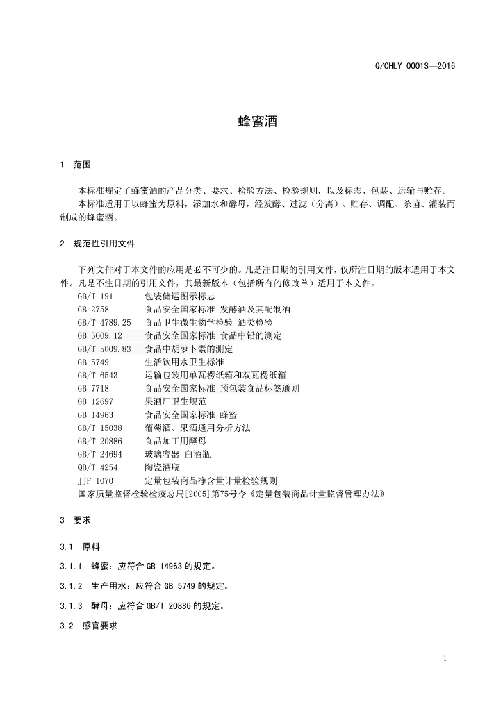 Q/CHLY 0001S-2016 淳化林源蜂蜜酒有限公司 蜂蜜酒