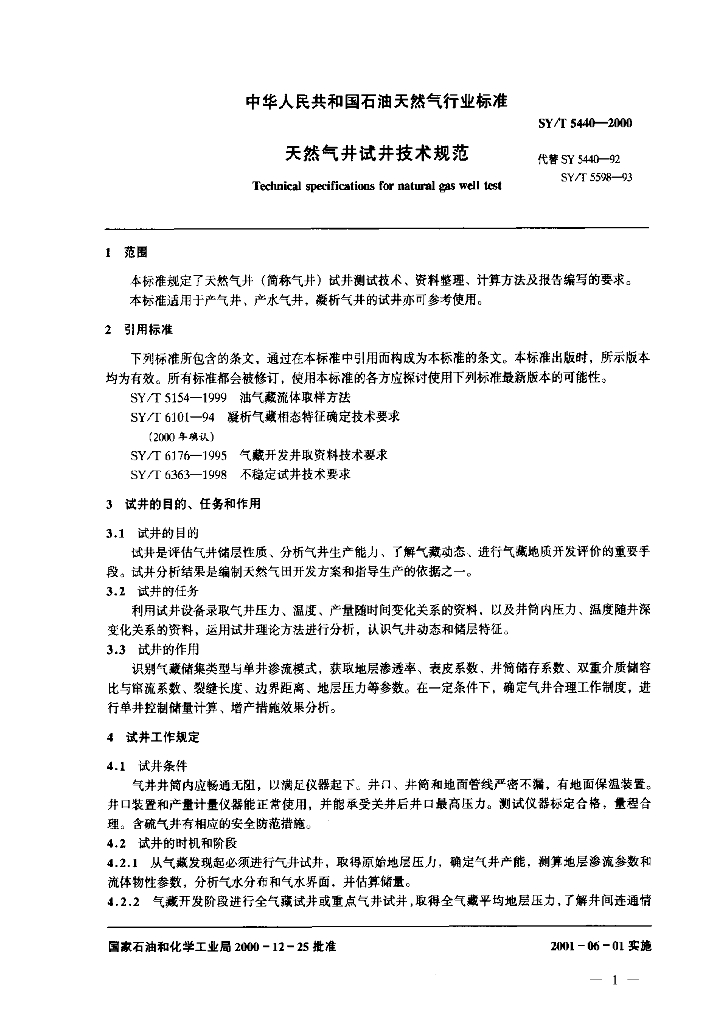 SY/T 5440-2000 天然气井试井技术规范