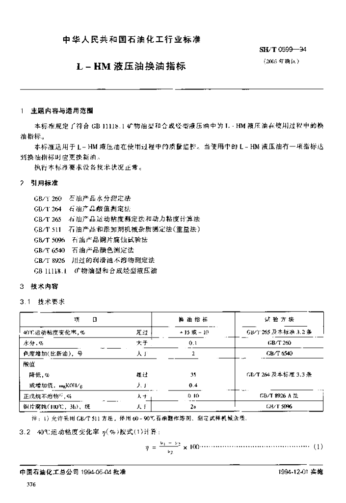 SH/T 0599-1994 L-HM液压油换油指标