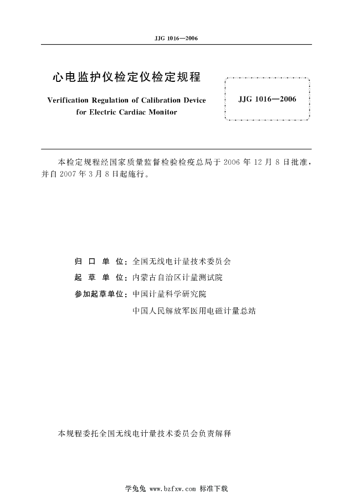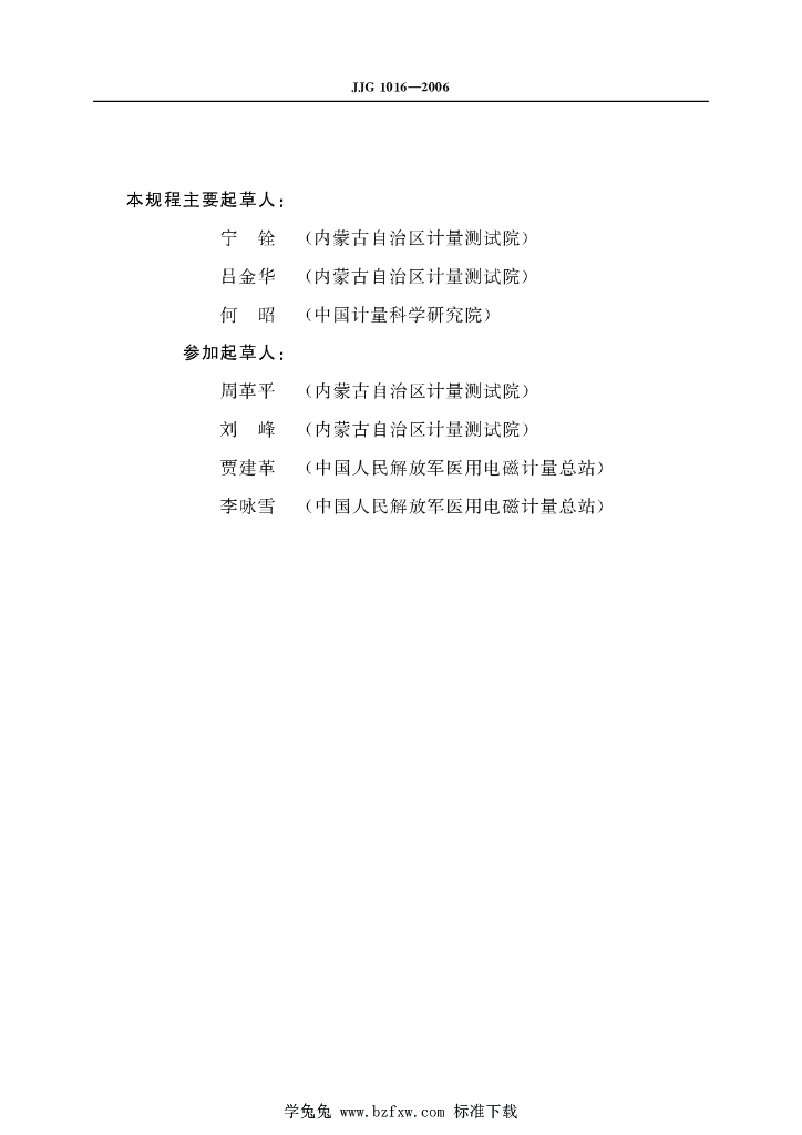 宁铨(内蒙古自治区计量测试院)、吕金华(内蒙古自治区计量测试院)、何昭(中国计量科学研究院)、周革平(内蒙古自治区计量测试院)、刘峰(内蒙古自治区计量测试院)、贾建革(中国人民解放军医用电磁计量总站)、李咏雪(中国人民解放军医用电磁计量总站)